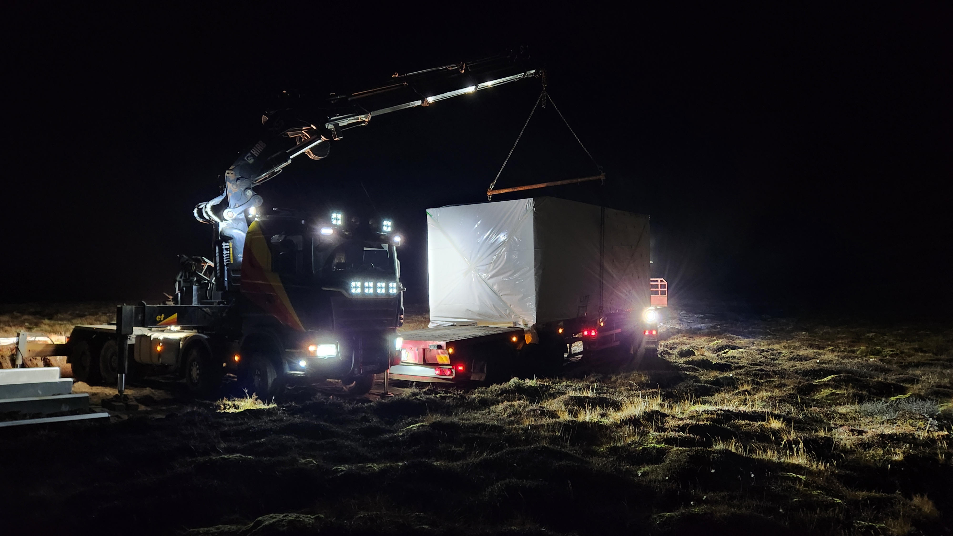 Aufgrund von Verzögerungen beim Transport wurden die Ferienhäuser erst nach Sonnenuntergang und in der Dunkelheit in Búðardalur angeliefert, was das Abladen massiv erschwerte. Plötzlich kam auch noch heftiger Regen und Wind dazu, so dass die Arbeiten unterbrochen werden mussten und erst zwei Tage später beendet werden konnten. Ich habe damals noch im Bauch meiner Mutter geschlafen, aber so, wie mir erzählt wurde, waren Esther & Pierre ziemlich gestresst und hatten Angst, dass etwas an den Häusern, insbesondere das Spiegelglas beschädigt werden könnte. Glücklicherweise passierte das nicht und jetzt sind die beiden überglücklich, dass die Spiegelhäuser an ihrem Platz stehen, mit Strom und Wasser versorgt sind und ganz toll aussehen. Der Aufwand und der Stress haben sich definitiv gelohnt.