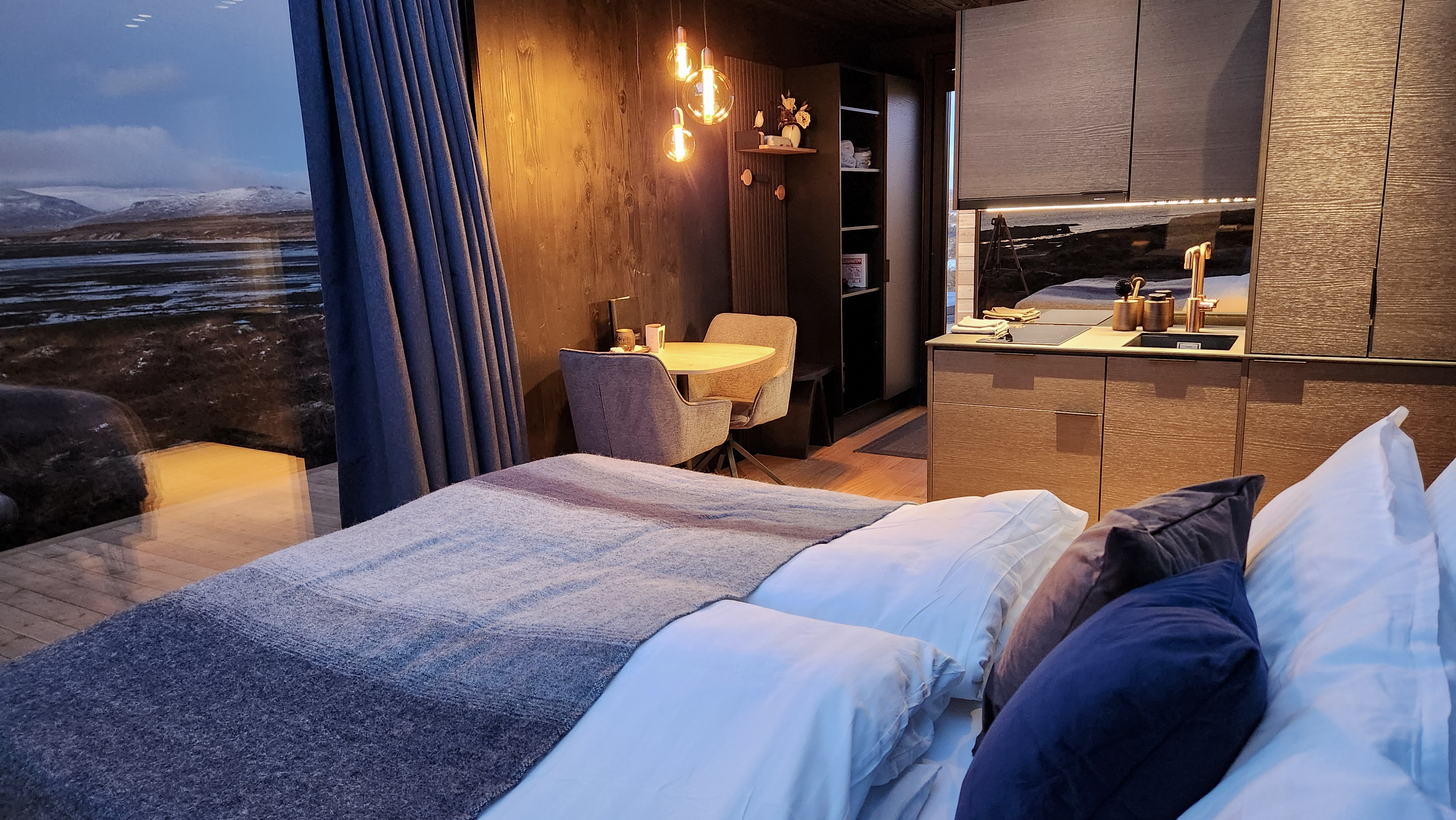 Natürlich ist auch das riesige Dachfenster über dem Bett wieder da, vor allem wegen der Nordlichter und des unendlichen Sternenmeeres. Küche und Bad sind auch wieder drin, alles richtig wau.