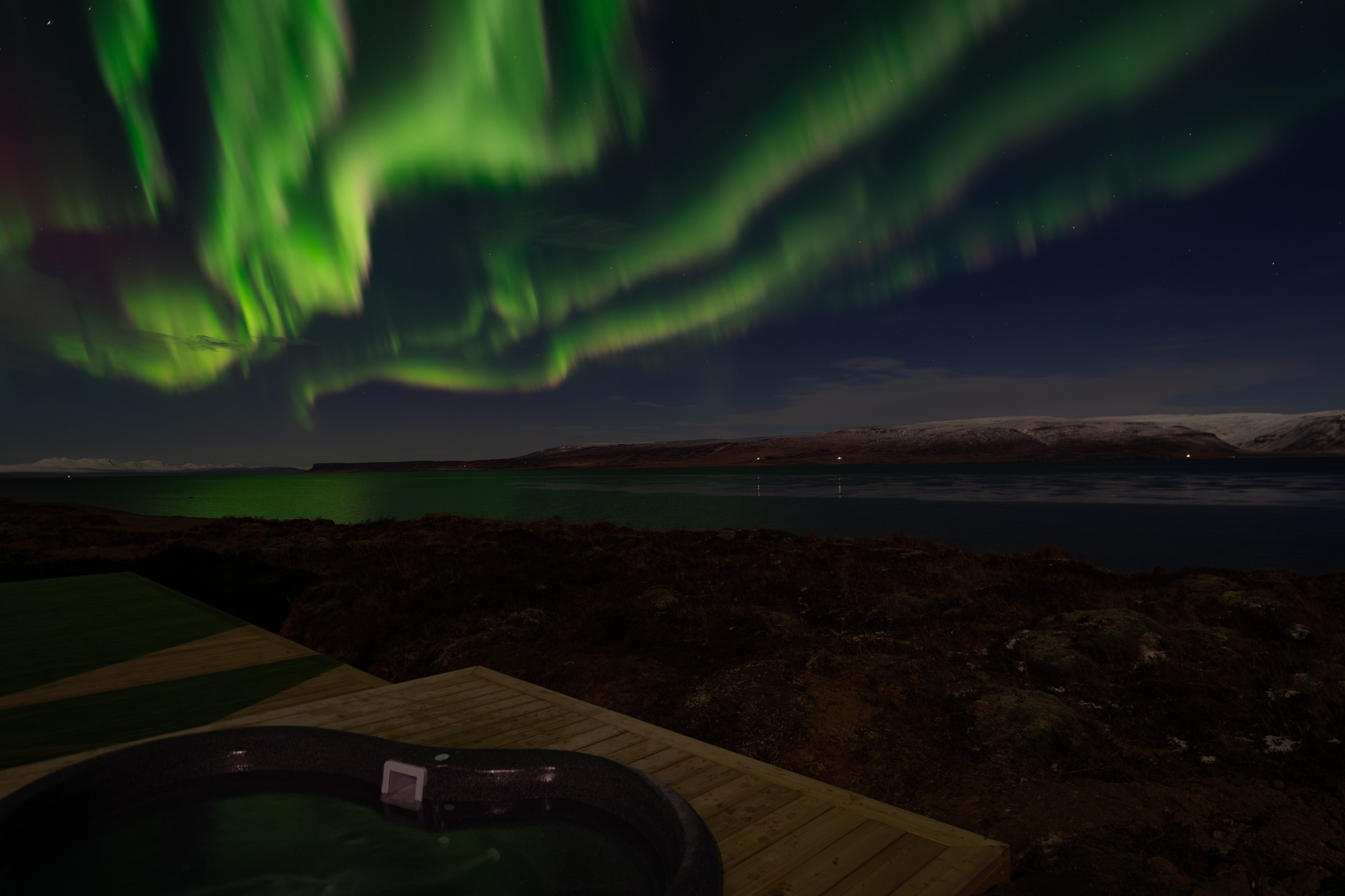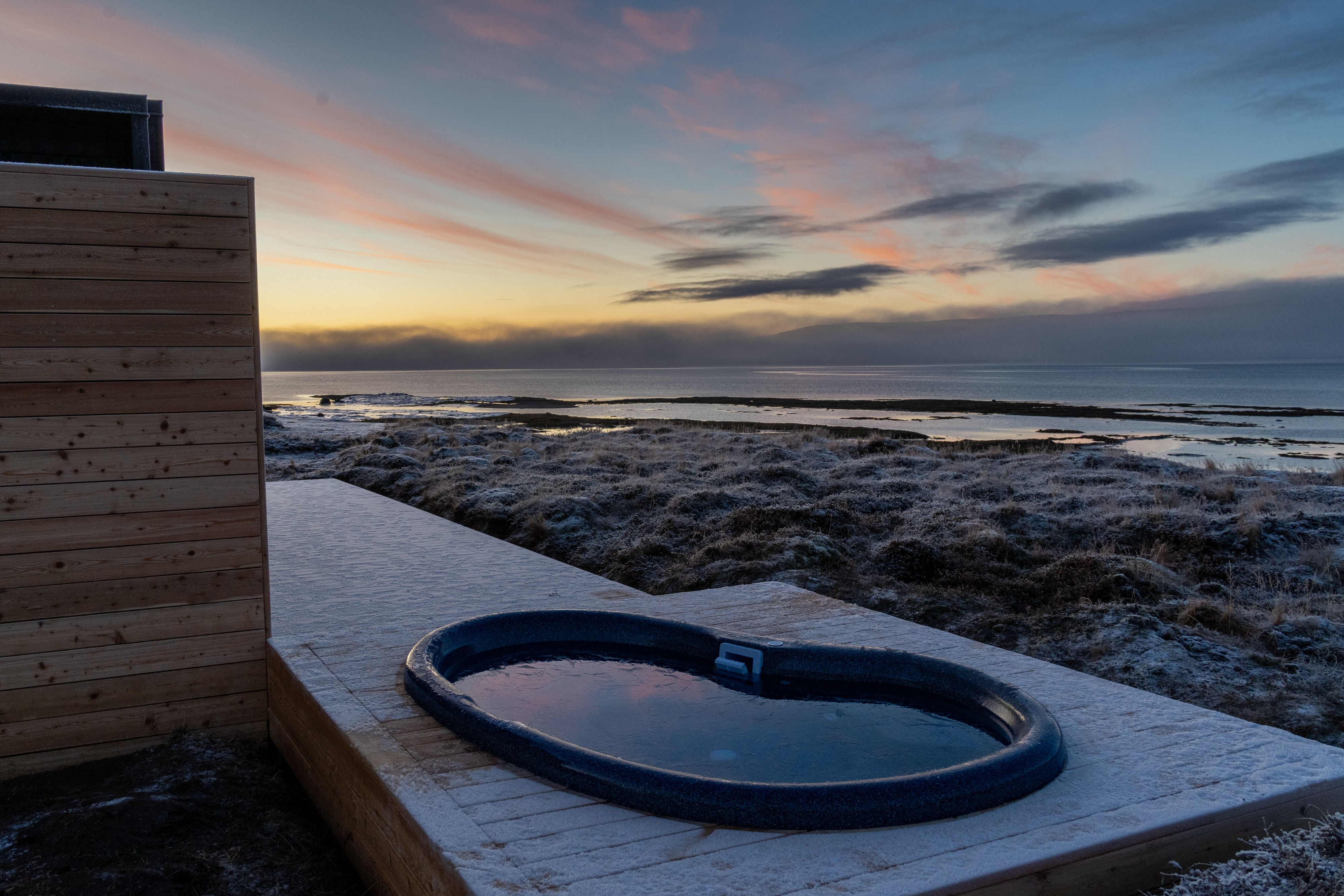 Jawohl, bei einem der neuen Ferienhäuser können die Zweibeiner jetzt im heissen Wasser sitzen, während sie die Meersicht, Sonnenuntergänge, Nordlichter oder einfach nur die wilde Natur bewundern. Vielleicht sogar mit einem Glas dieser roten Zauberflüssigkeit, die ich nie probieren darf. Ich glaube, sie nennen es „Wein“. Klingt interessant, riecht aber komisch.