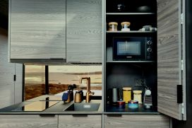 Panoramic views and privacy: enjoy the view through the large mirrored windows without having to sacrifice your privacy. The mirrored glass prevents the view inwards during daylight hours and practical curtains provide blackout protection even on summer days of endless brightness. In addition, the large skylight directly above the bed promises a romantic night under the starry sky.