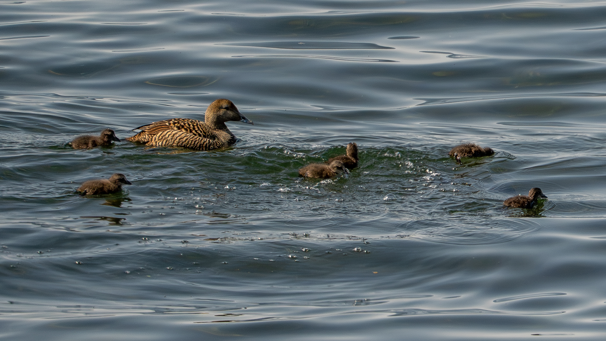 At the same time, the fuzzy chicks of the eider ducks appeared on the beach. They now swim up and down the coast in groups. The little ones are apparently excellent divers, here one moment, disappearing into the sea the next, and then suddenly popping back up again.